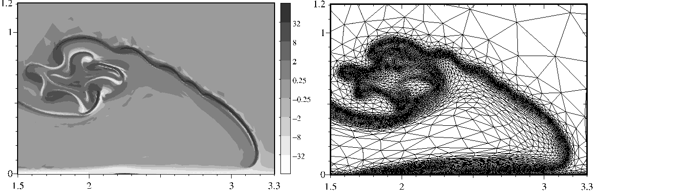 [right] A yield stress fluid (e.g. mud) flowing around an obstacle ; adaptive mesh